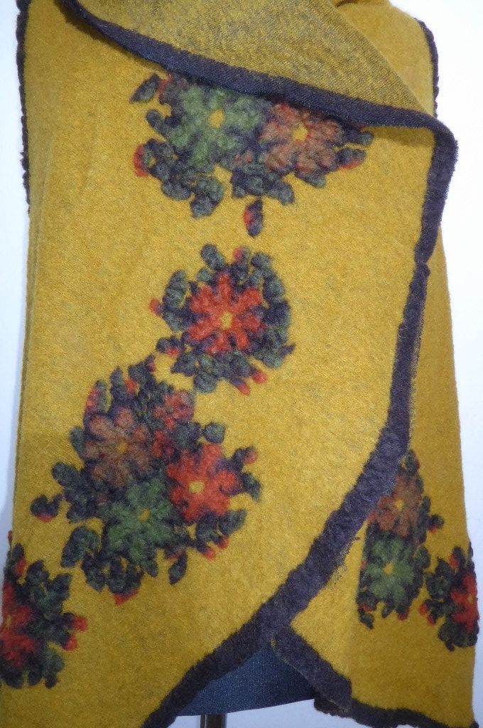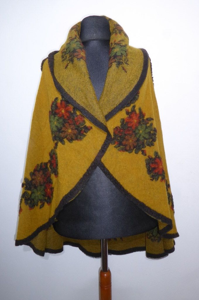 | Verarbeitung: | Diese ausgefallene Weste ist wunderbar warm und bequem und gleichzeitig ein ausdrucksvoller Hingucker. Sie ist aus currygelber gefilzter Wolle. Die Applikationen in oliv und koralle und der dunkelgraue Rand setzen sich farblich sehr schön ab. Der weite Kragen kann auch als wärmende Kopfbedeckung genutzt werden. Durch den lockeren Schnitt passt die Weste von Grösse 38 bis 46. Einen Verschluß gibt es nicht. Material: 80% Wolle, 20% Polyester. Schauen Sie auch bei Wollröcken. |