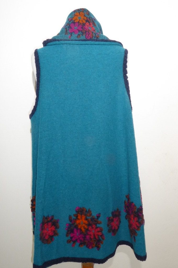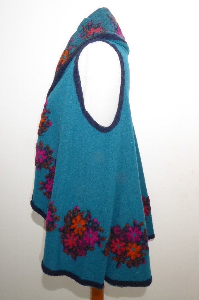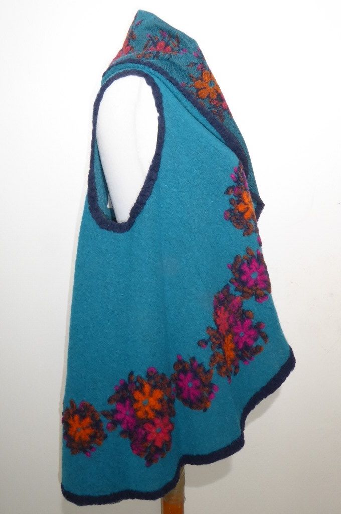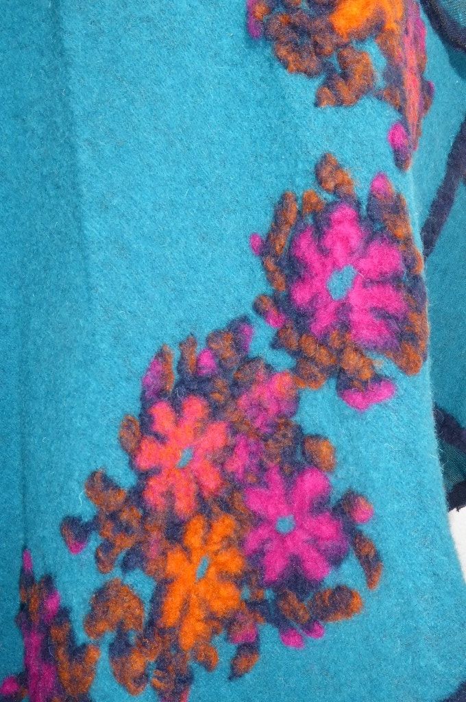 | Verarbeitung: | Diese ausgefallene Weste ist wunderbar warm und bequem und gleichzeitig ein ausdrucksvoller Hingucker. Sie ist aus blau-petrolfarbener gefilzter Wolle. Die Applikationen in fuchsia, orange und koralle und der dunkelblaue Rand setzen sich farblich sehr schön ab. Der weite Kragen kann auch als wärmende Kopfbedeckung genutzt werden. Durch den lockeren Schnitt passt die Weste von Grösse 38 bis 46. Einen Verschluß gibt es nicht. Material: 80% Wolle, 20% Polyester. Schauen Sie auch bei Wollröcken. |