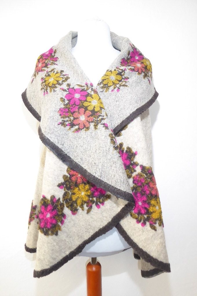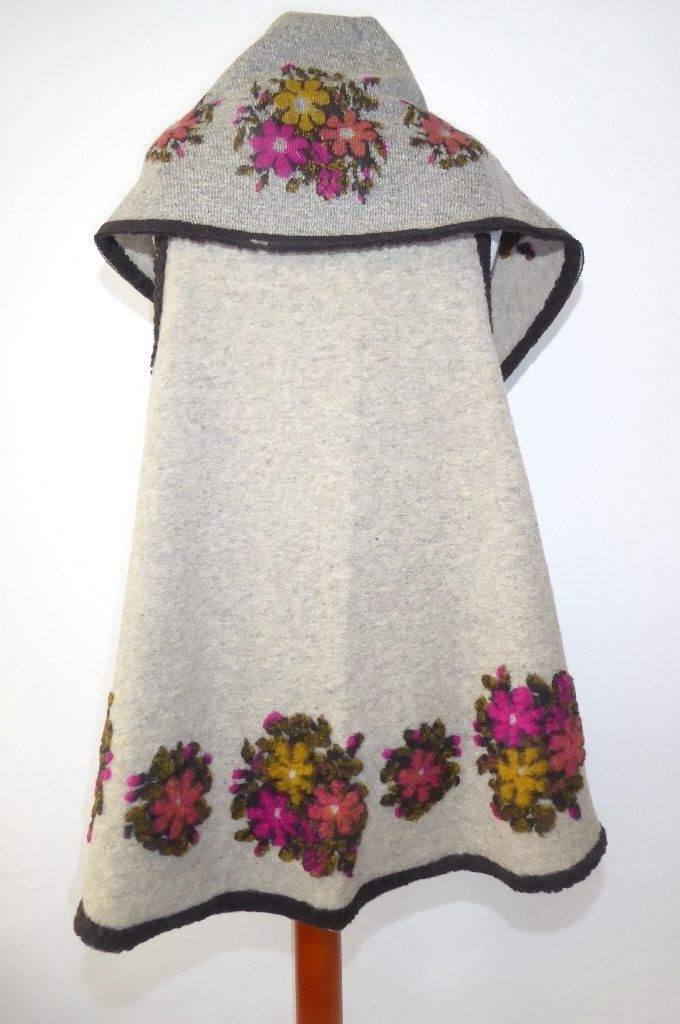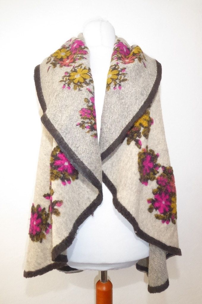 | Verarbeitung: | Diese ausgefallene Weste ist wunderbar warm und bequem und gleichzeitig ein ausdrucksvoller Hingucker. Sie ist aus hellgrauer gefilzter Wolle. Die Applikationen in verschiedenen Grautönen und der Rand in schwarz setzen sich farblich sehr schön ab. Der weite Kragen kann auch als wärmende Kopfbedeckung genutzt werden. Durch den lockeren Schnitt passt die Weste von Grösse 38 bis 46. Einen Verschluß gibt es nicht. Material: 80% Wolle, 20% Polyester. Schauen Sie auch bei Wollröcken. |