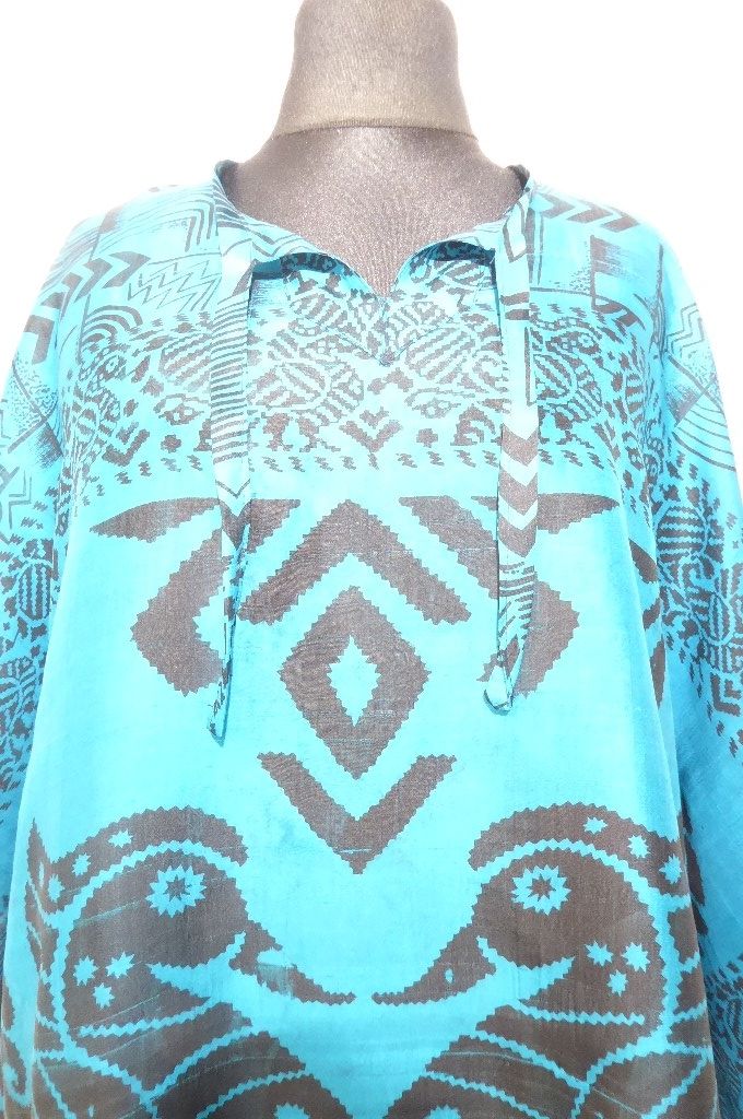 | Info zu Upcycling: | diesen Artikel haben wir aus dem Stoff eines indischen 2nd Hand Saris neu genäht. Es gibt im Stoff kleinste Gebrauchsspuren, die aber durch das ausdrucksvolle Muster kaum zu sehen sind. Die Tunika ist umweltfreundlich produziert und ein Einzelstück. |