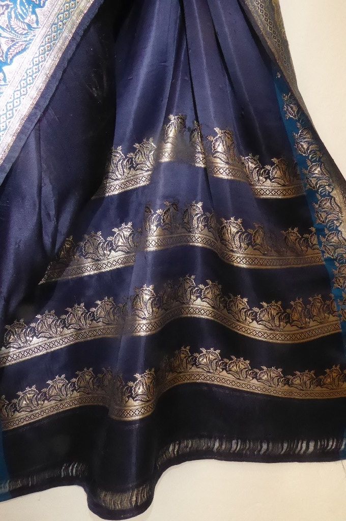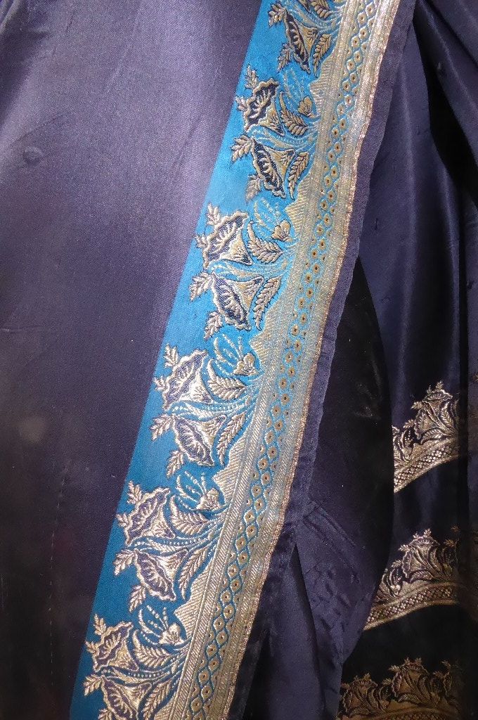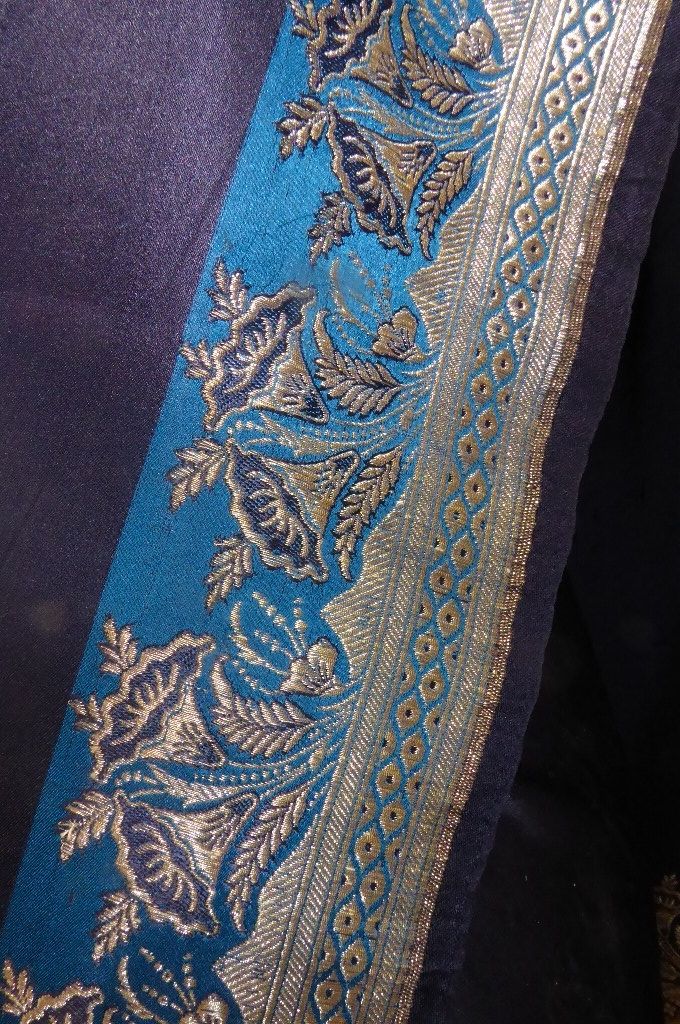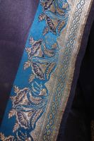 | Farbe: | nachtblau, Borten und Kopfstück sehr helles gold - fast silber, Längsborten haben einen 7 cm breiten Streifen in hellerem blau |