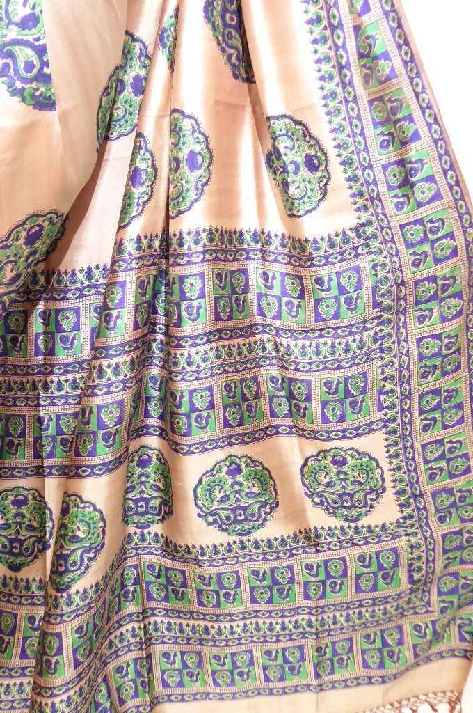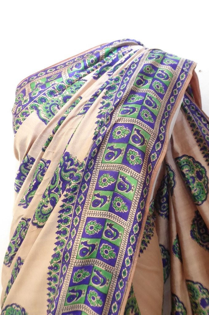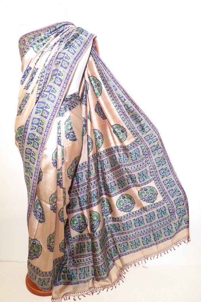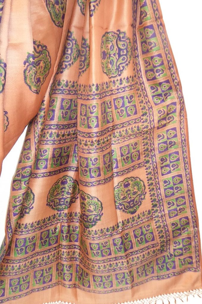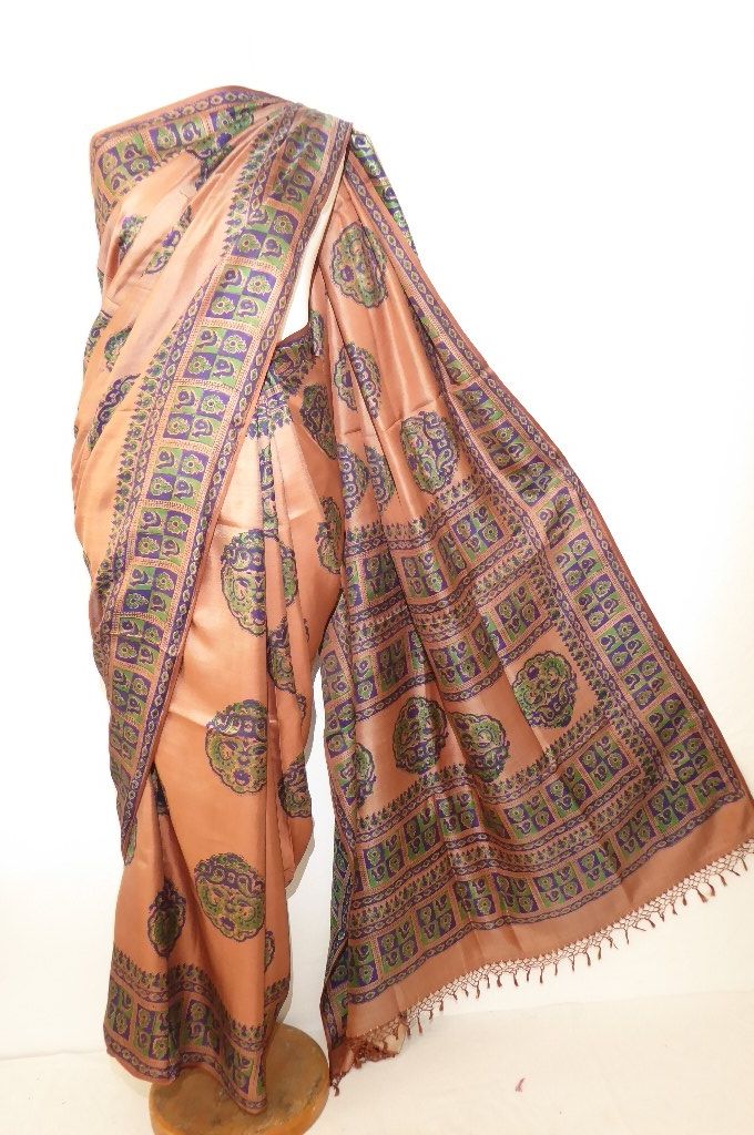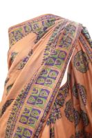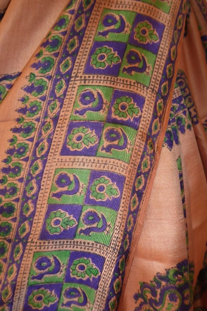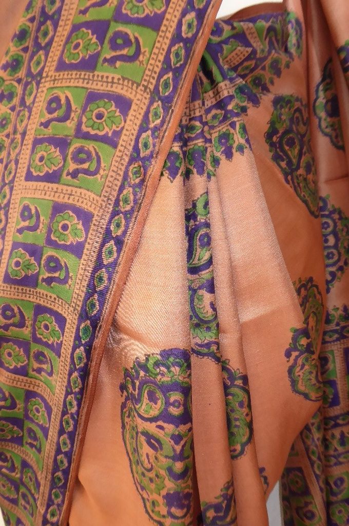 | Verarbeitung: | die Muster sind von Hand gestempelt, der Sari hat zwei Schauseiten, vorn helles braun, Rückseite cremeweiß |