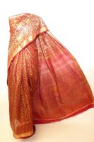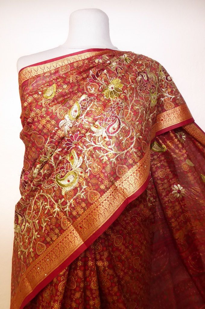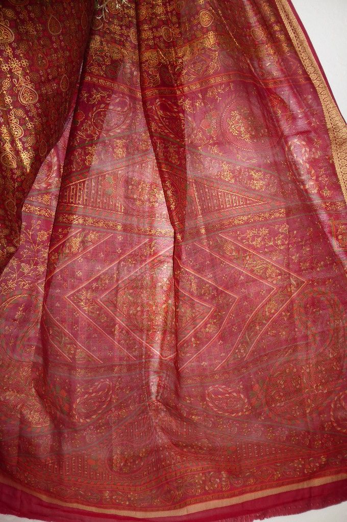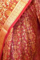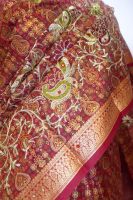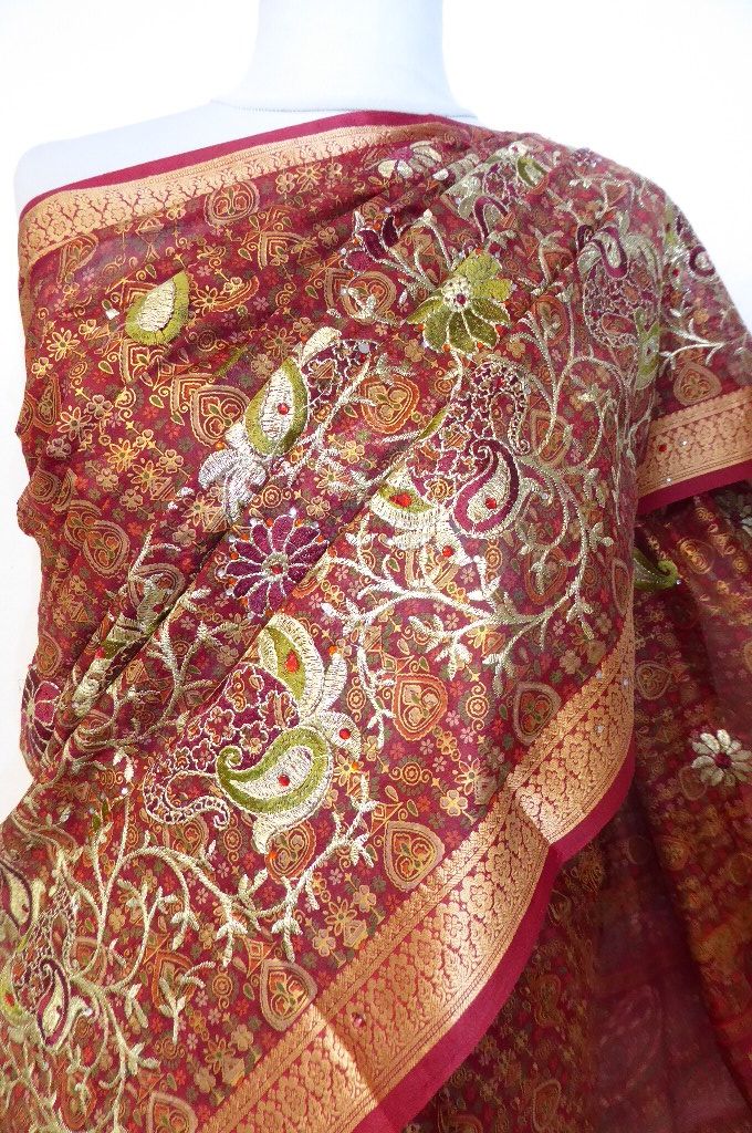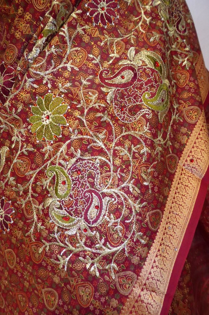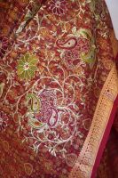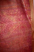 Verarbeitung: | über eine Länge von 1,20 m aufwändige Brokatstickerei mit Rankenmotiven und Paisleys, ganzflächig ist der Sari mit filigranen Motiven gemustert, die 5 cm breite Borte aus gewebtem Glanzgarn ist an beiden Längsseiten durchgehend |