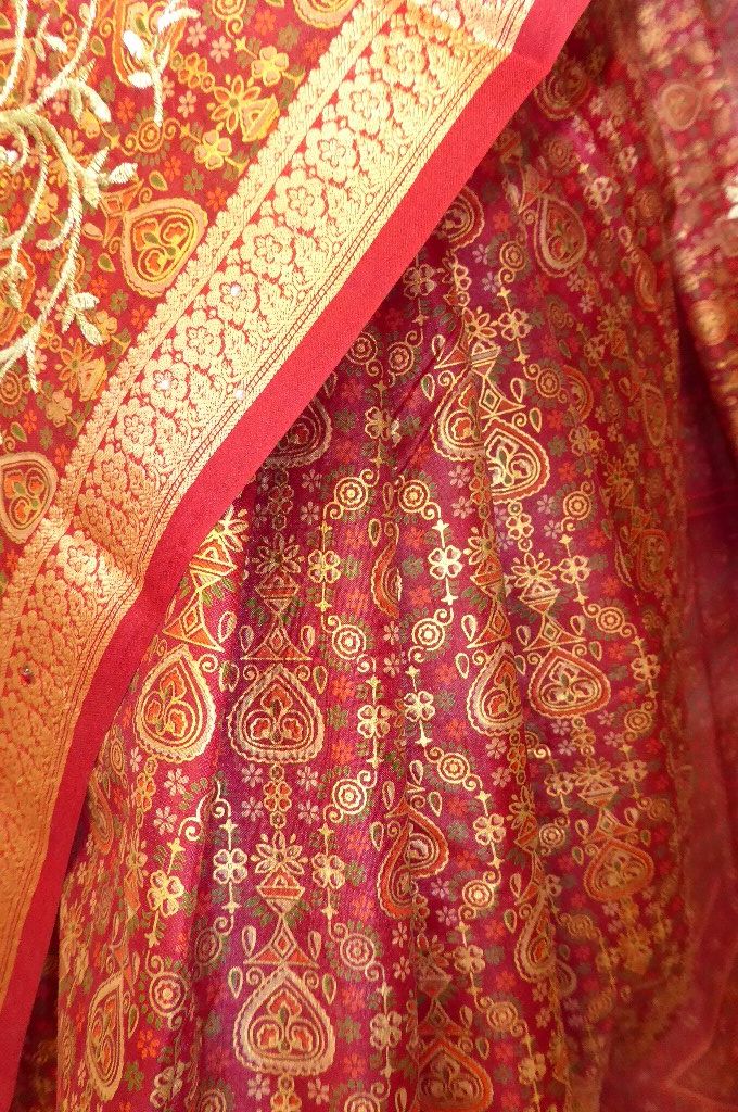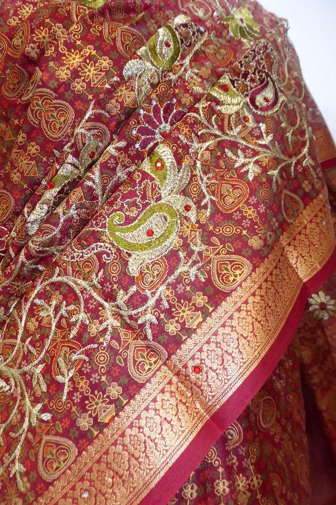 Farbe: | indisch rot, Brokat hellgold, Muster gold und grün, Borte hellbeige/gold, Perlen rot |