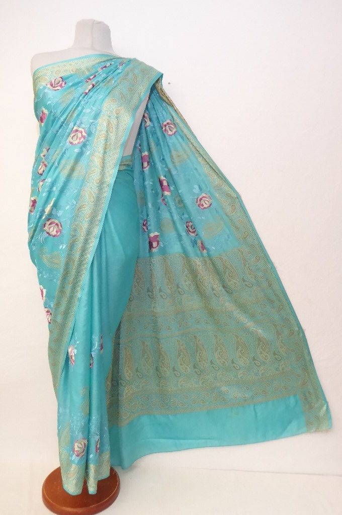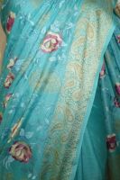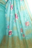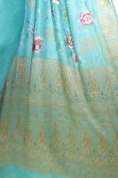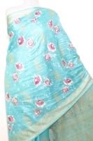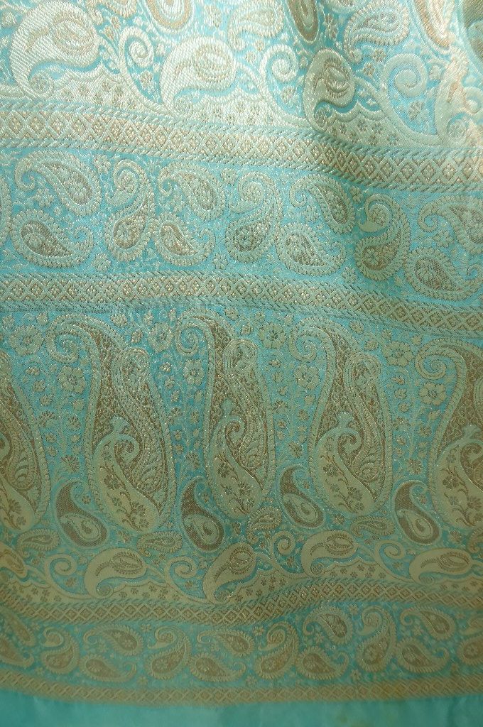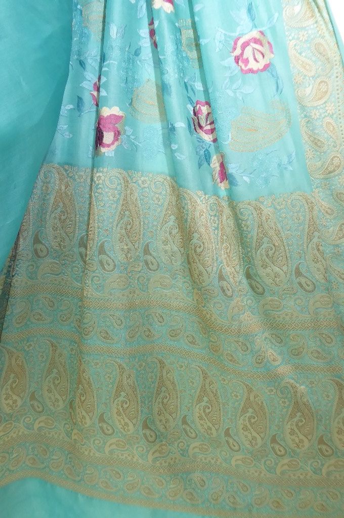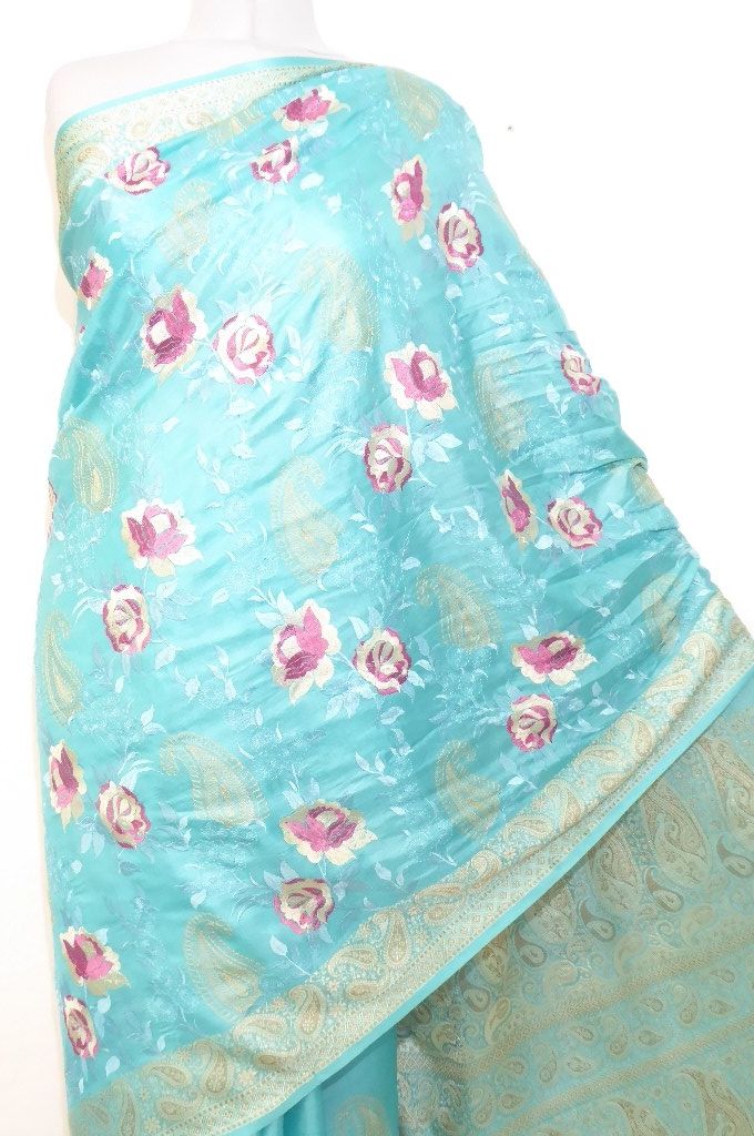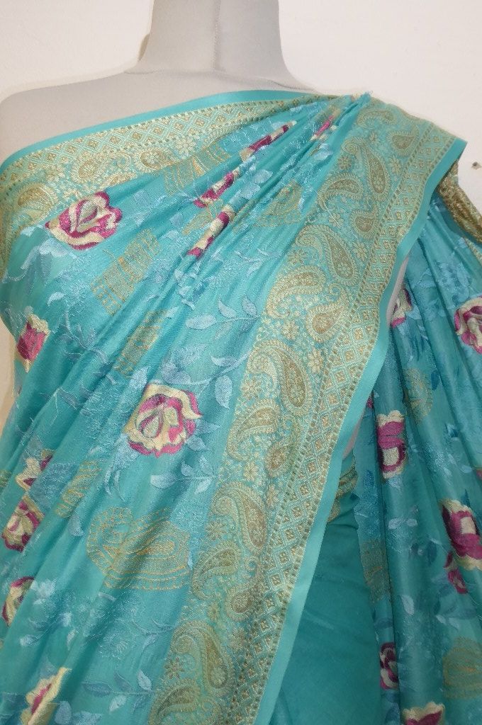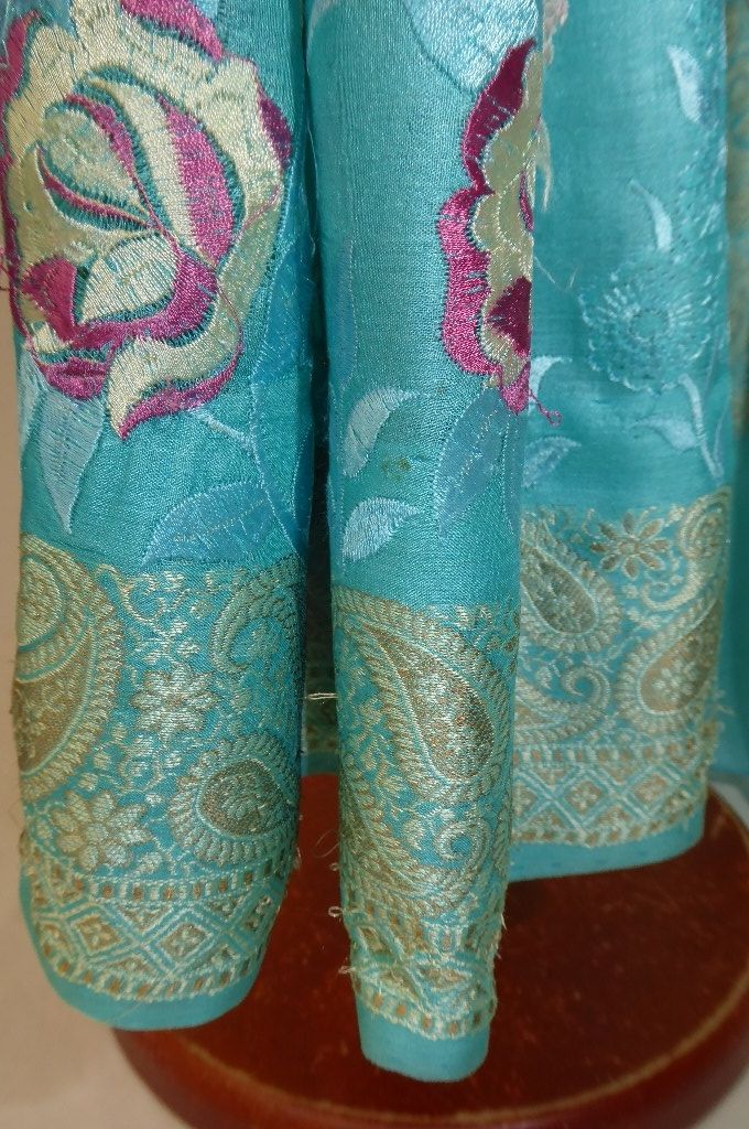 Seidensari türkisblau mit Blumenstickerei und gewebten Paisley-Bordüren