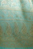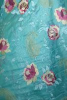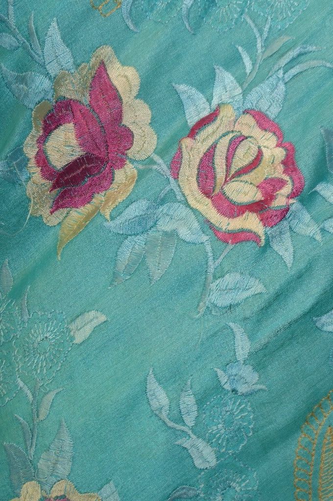 Farbe: türkisblau, gestickte Blumen himbeerrot und creme, gestickte Paisleys goldfarben, gestickte Blätter und Ranken türkisblau