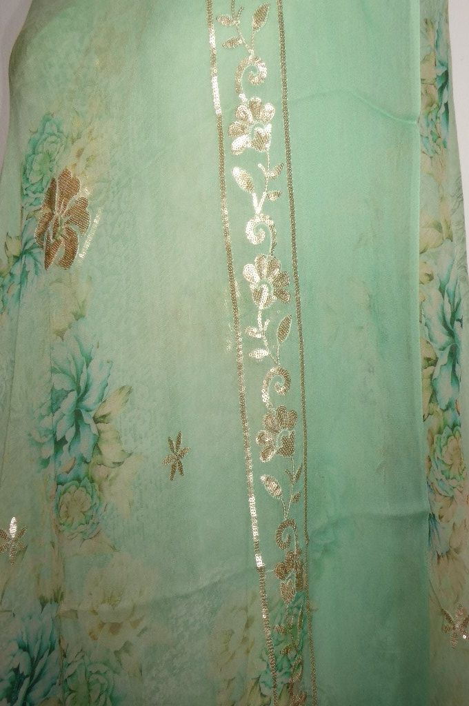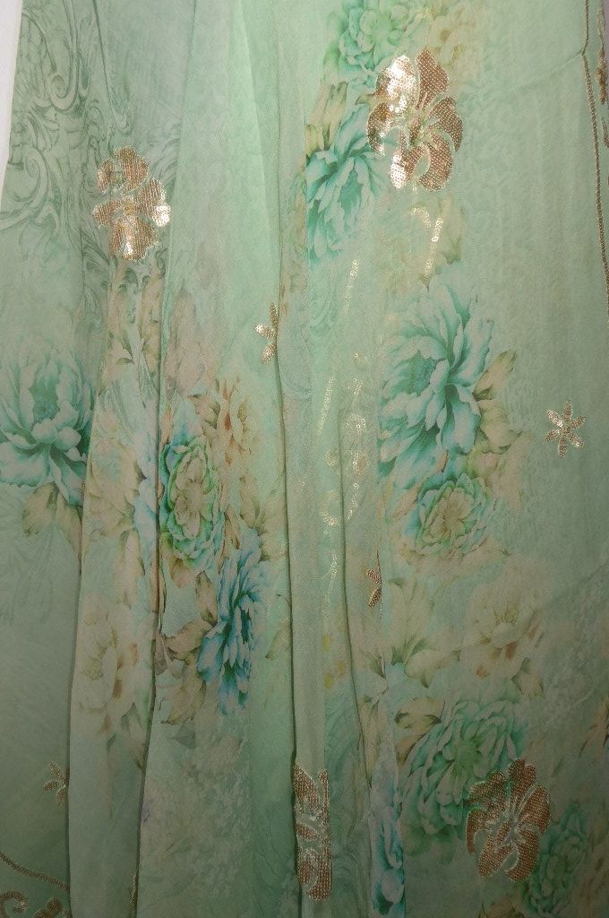 | Verarbeitung: | zarte Aquarell-Malerei mit blumenmotiven, einige Blütenornamente aus Goldpailletten gestickt, aus Pailletten gestickte Bordüren an beiden Längsseiten |