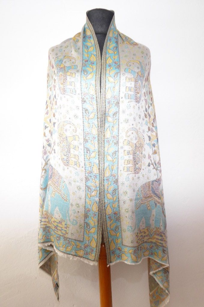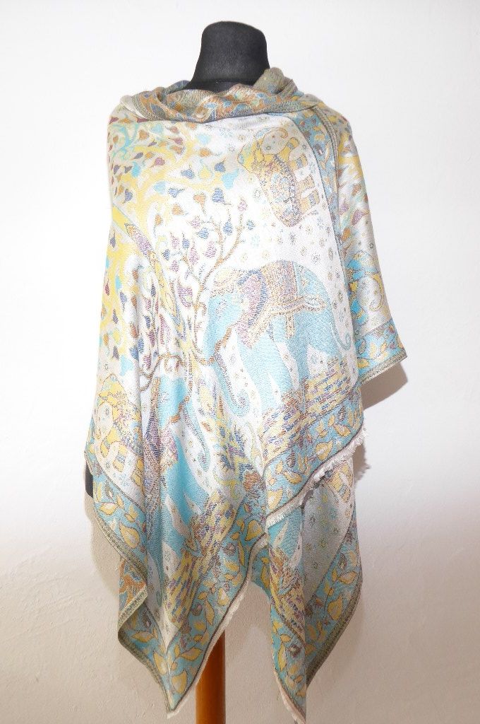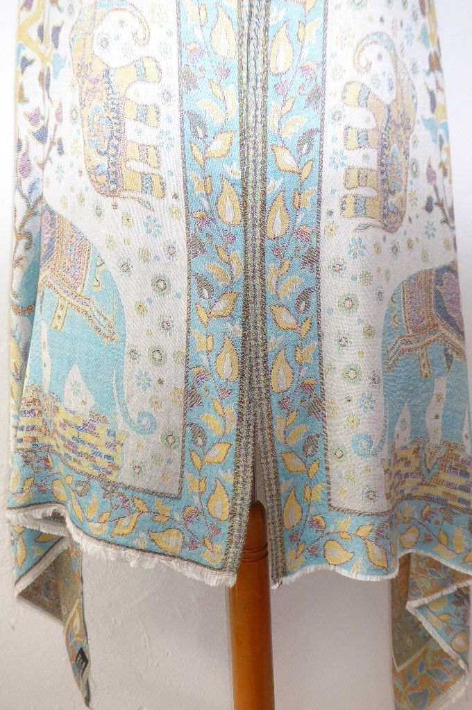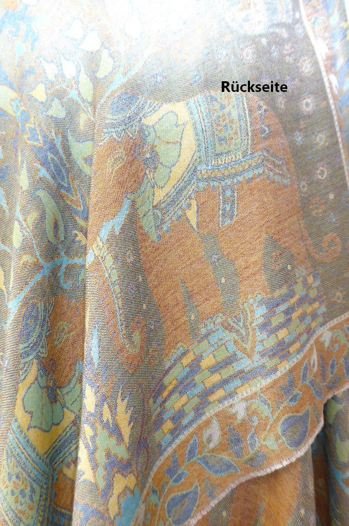 | Verarbeitung: | gewebte klassisch indische Motive wie Elefanten, Lebensbaum und Bordüren, mit Fransen |