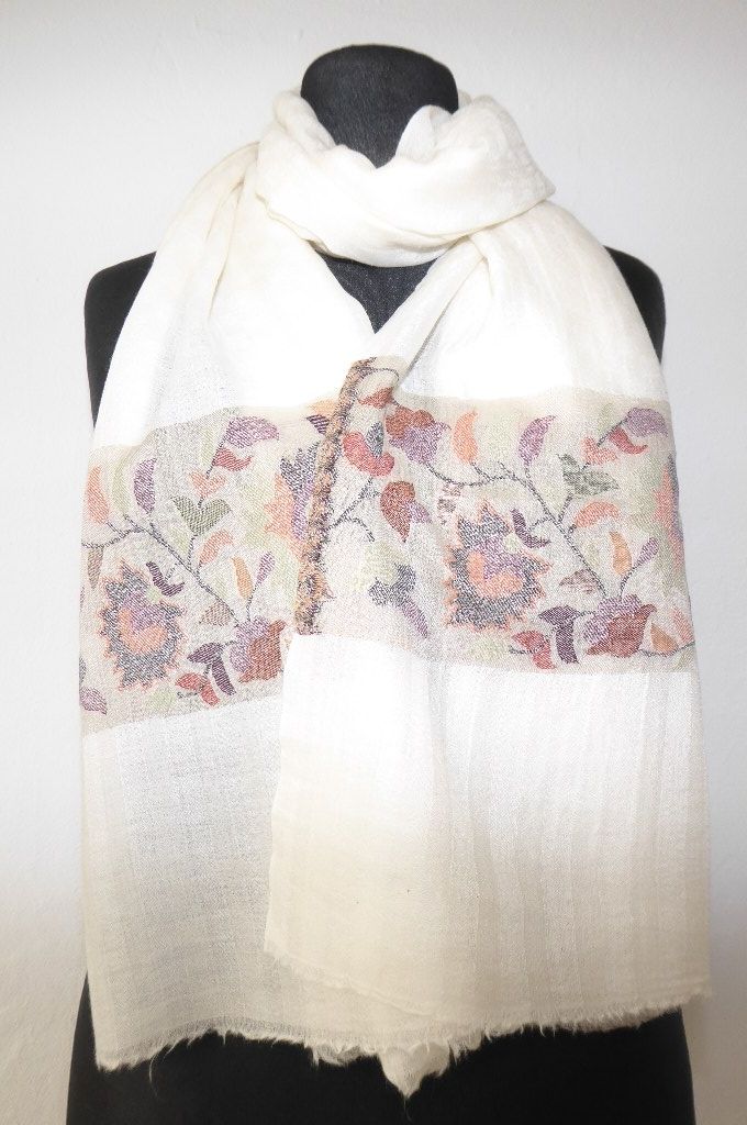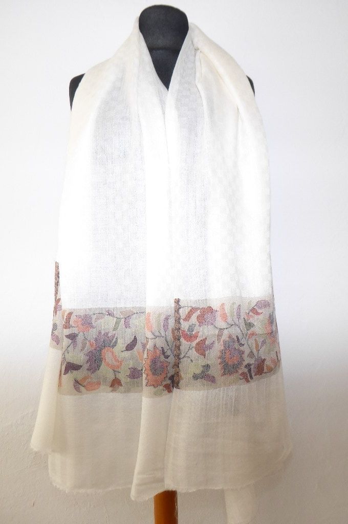 | Verarbeitung: | Wollschal aus sehr fein gesponnener und locker gewebter Wolle mit gewebtem zartem Jacquardmuster. Der Schal ist leicht, weich und kratzt nicht. Er trägt sich sehr angenehm. Obwohl so leicht und zart, hält der Schal wunderbar warm und wird Sie als guter Freund durch kühle Tage begleiten. |