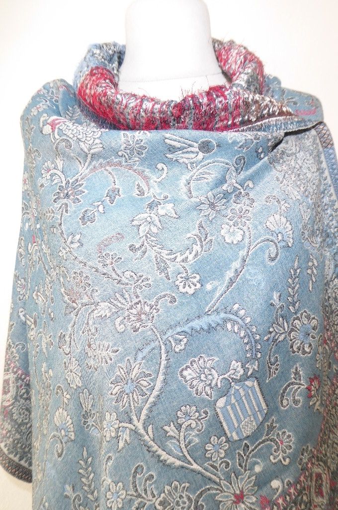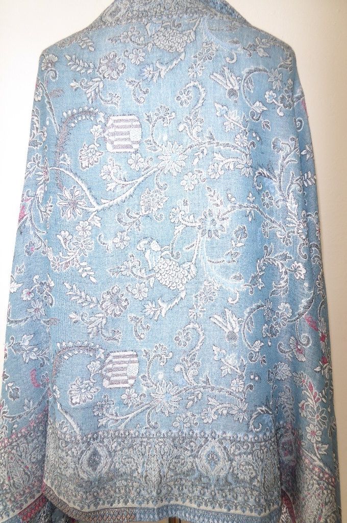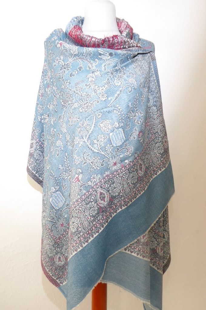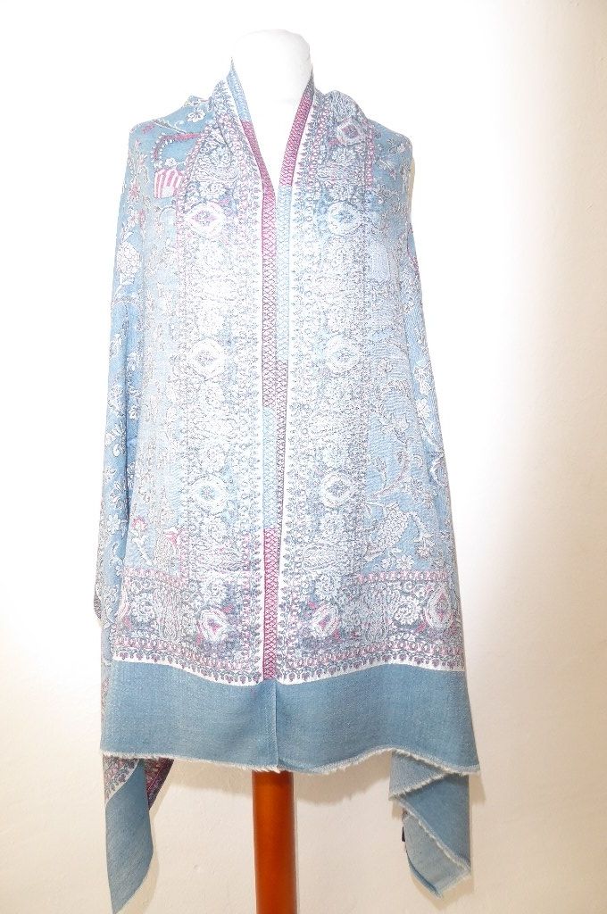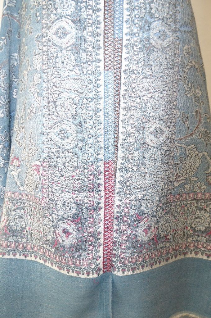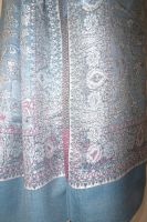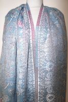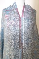 | Verarbeitung: | sehr aufwändig gewebte filigrane Muster, auf der Rückseite wurden die durchlaufenden Webfäden geschnitten, wodurch der Schal trotz der vielen gewebten Muster leicht und weich bleibt, das Tragegefühl ist seidig leicht und sehr angenehm. |