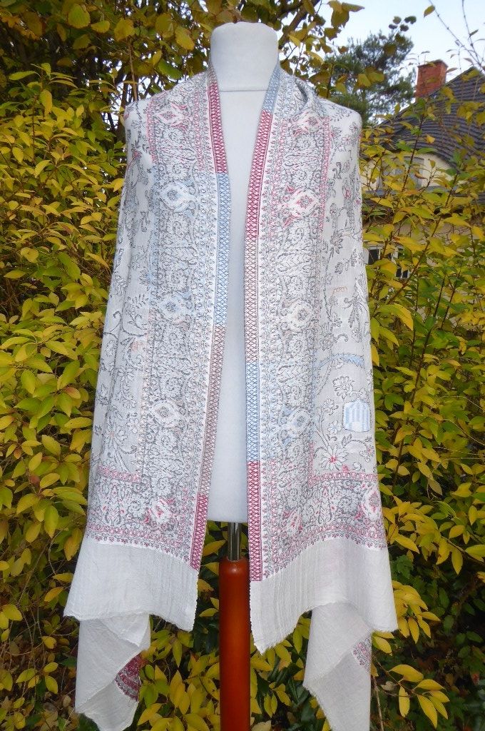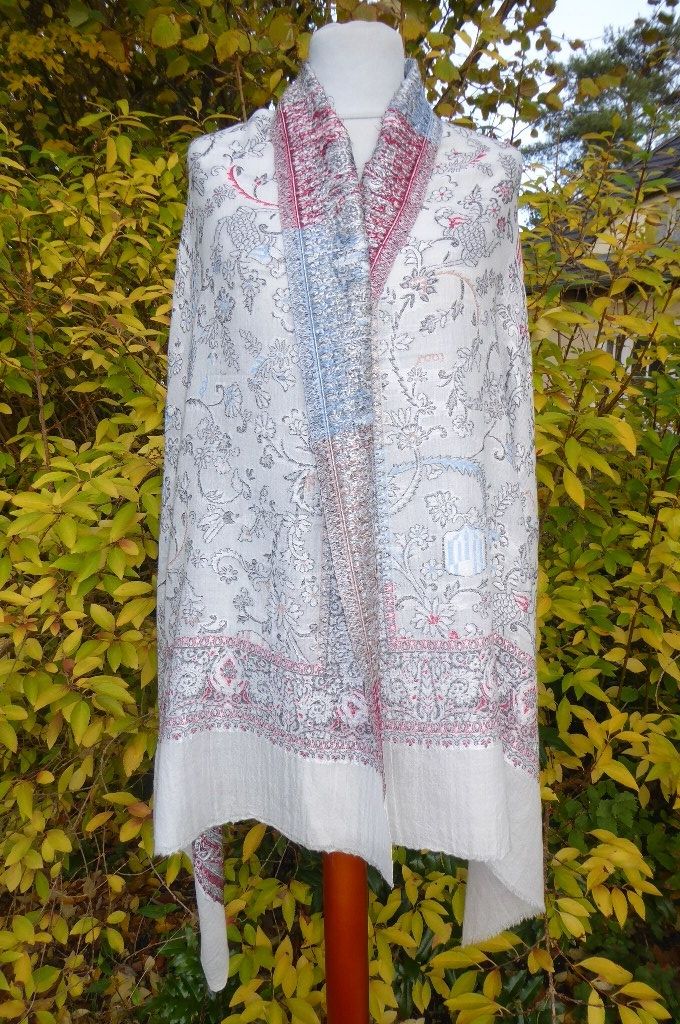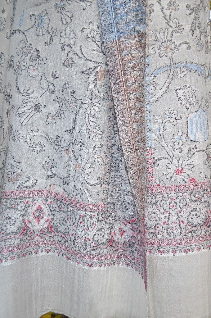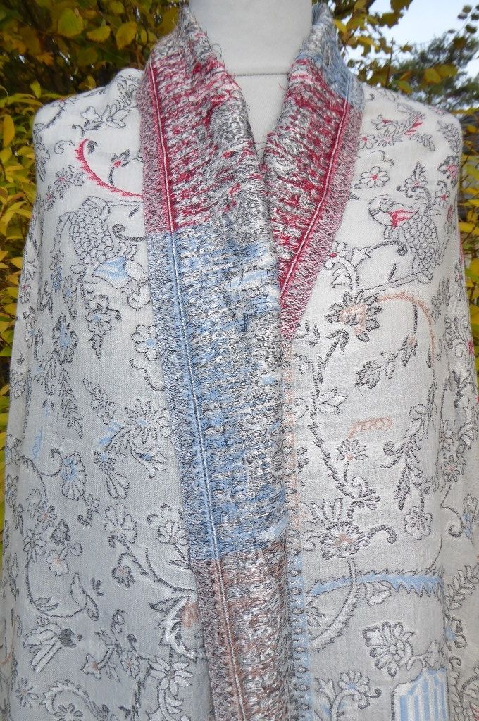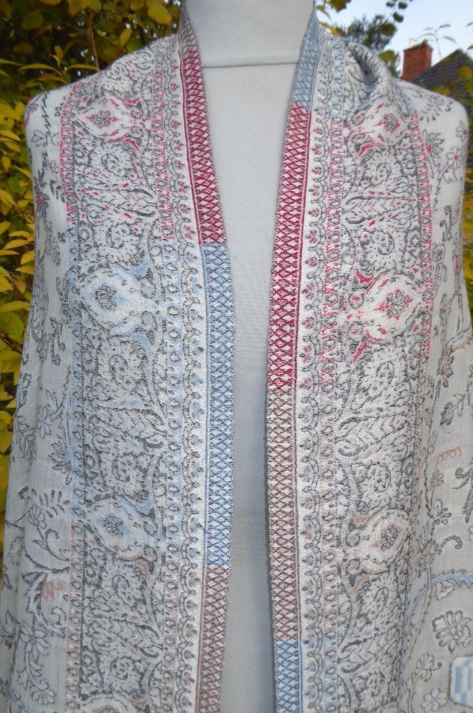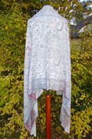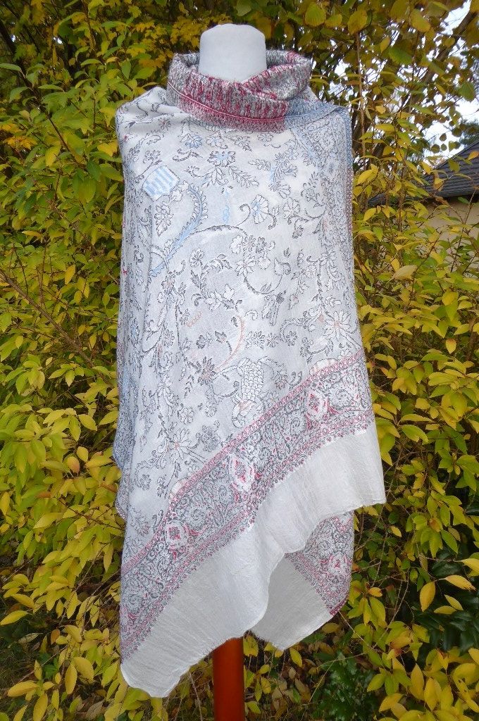 | Verarbeitung: | sehr aufwändig gewebte filigrane Muster, auf der Rückseite wurden die durchlaufenden Webfäden geschnitten, wodurch der Schal trotz der vielen gewebten Muster leicht und weich bleibt, das Tragegefühl ist seidig leicht und sehr angenehm. |