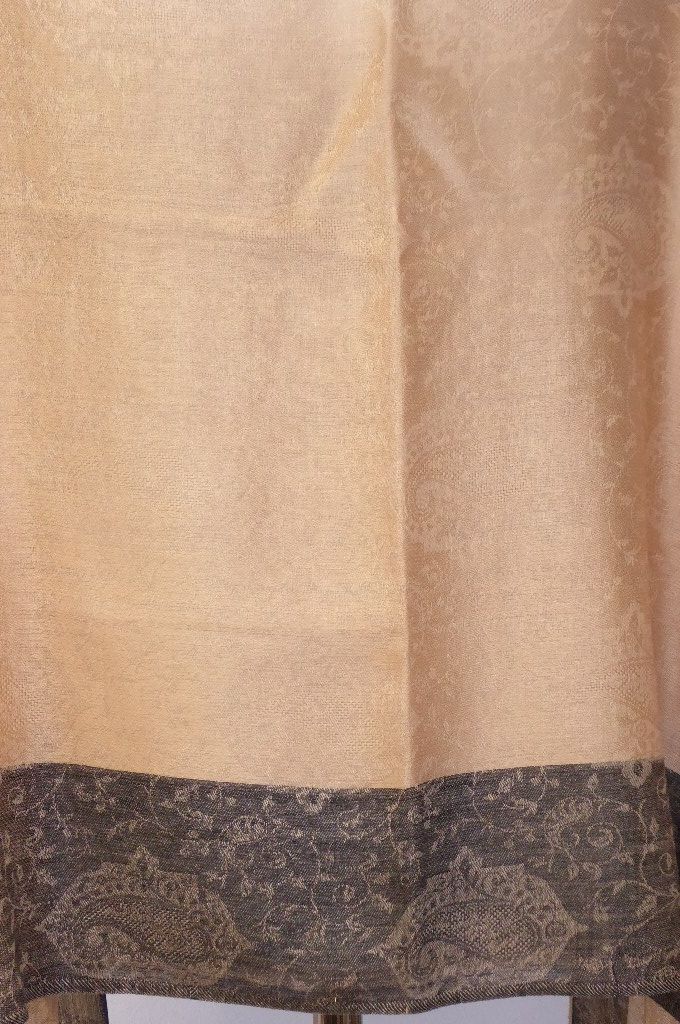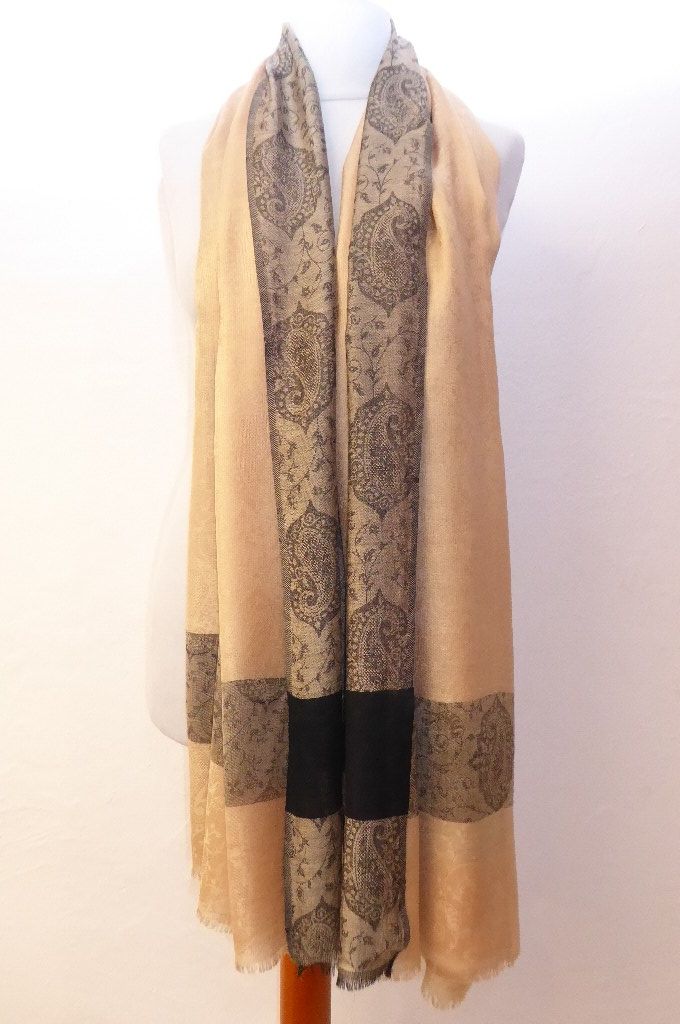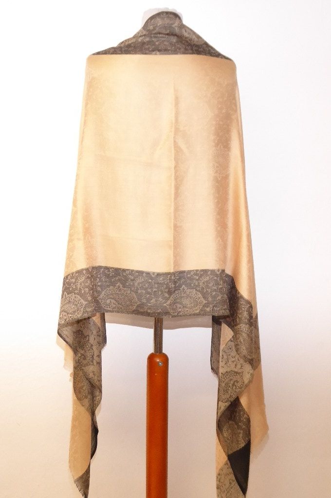 Material: 50% Seide, 50% Wolle, sehr fein gesponnen und gewebt mit gewebten Paisley-Motiven