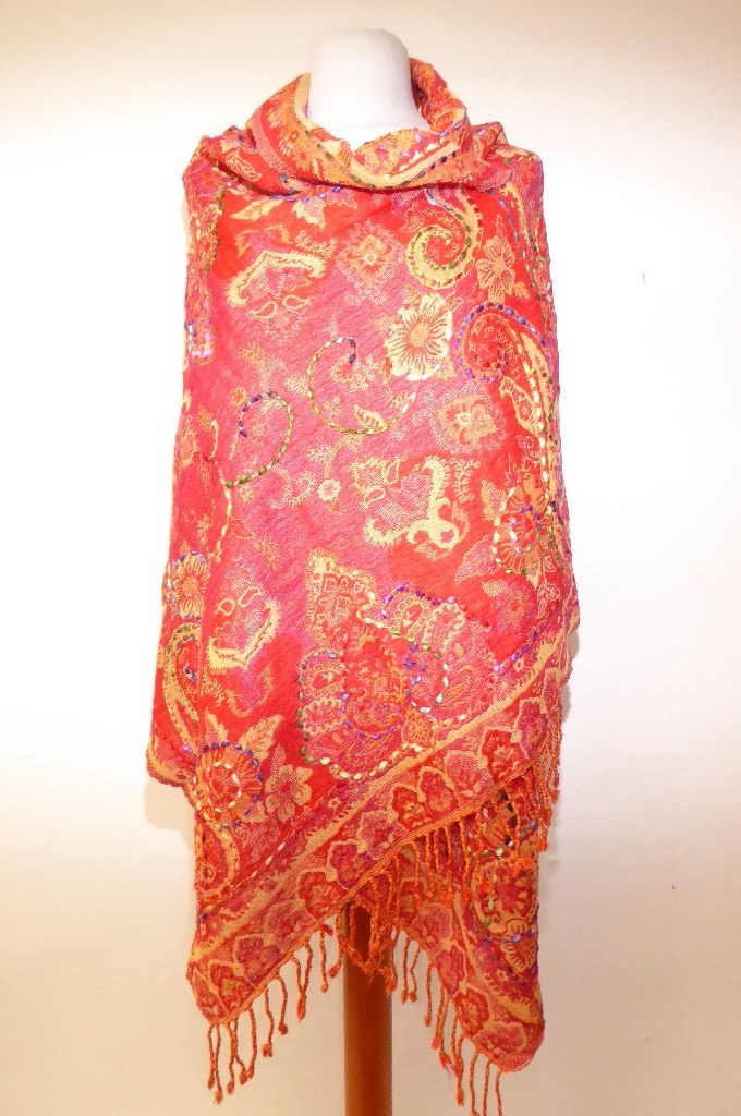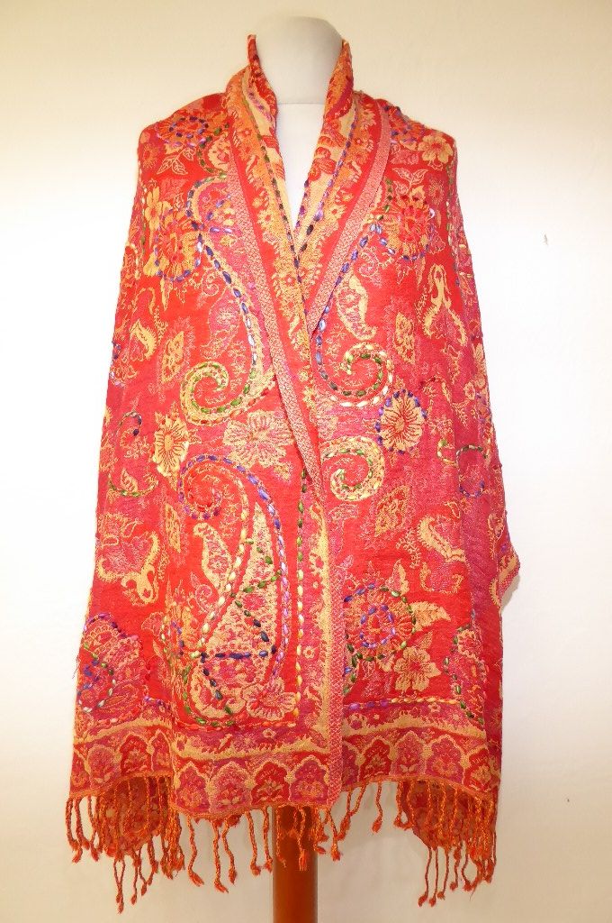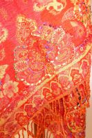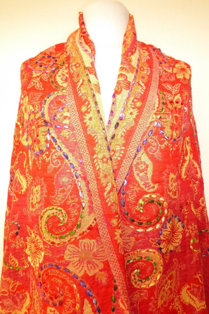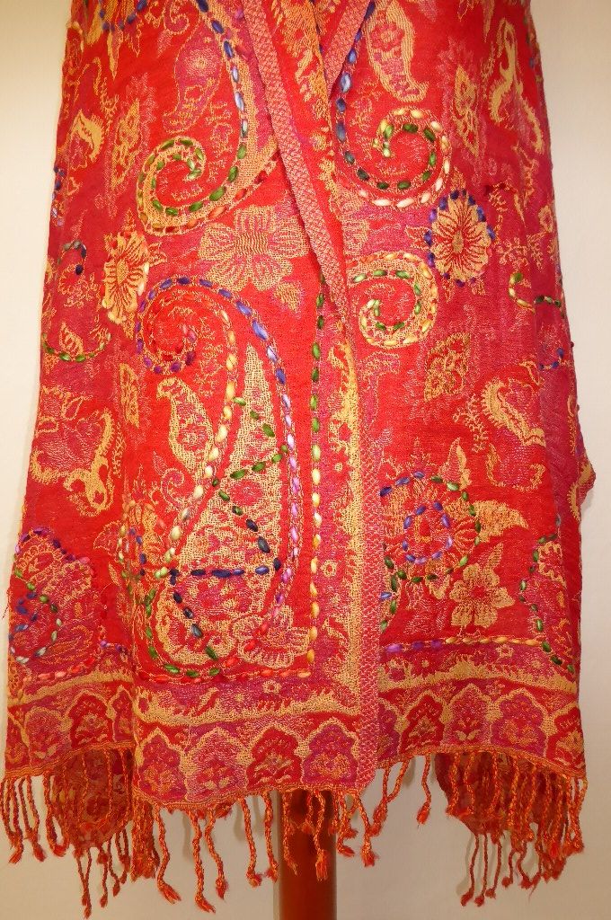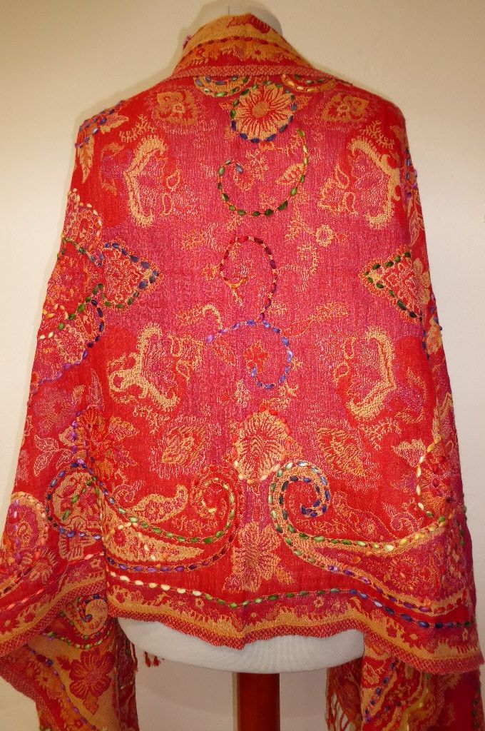 Verarbeitung: handgewebt, mit dicken Wollfäden bestickt, Fransen